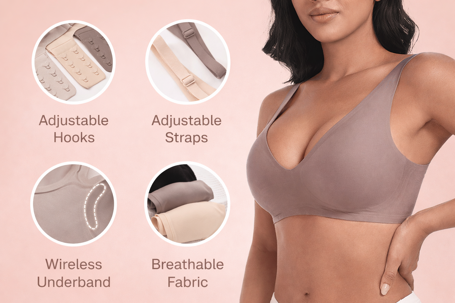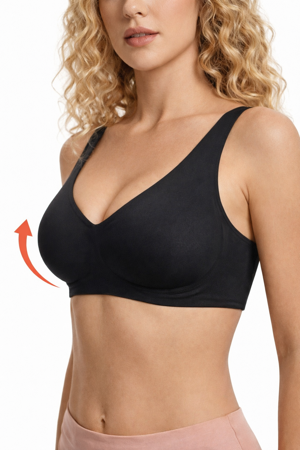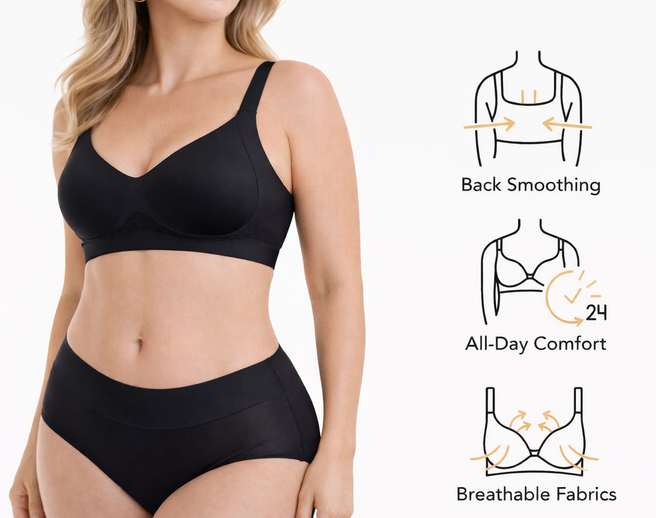Wide side panels and a smooth back help reduce back bulge and underarm spill.